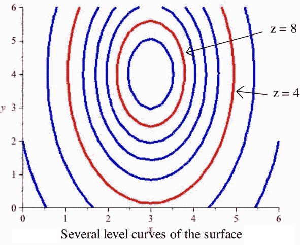 If we move all of those curves to the xy–plane (or, equivalently, view them from directly overhead), the result is a 2-dimensional graph of the level curves of the original surface. This is the contour diagram.