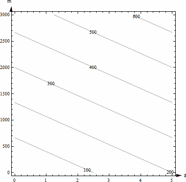 We'll set \( C(d,m)=40d+0.15m=c \) for \(c =\) 0, 100, 200, 300, and 400 and draw the curves in the \(dm\)-plane.